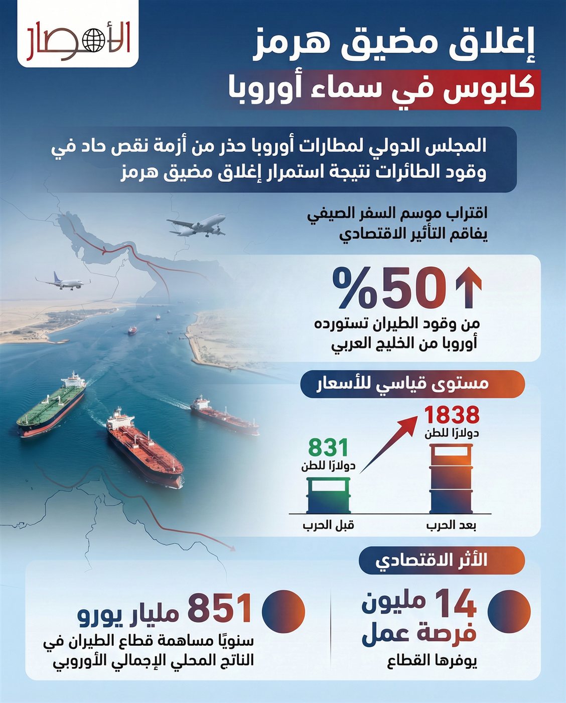 وأكدت الهيئة أن استمرار تعطل الملاحة أو إغلاق المضيق لفترة طويلة، خصوصًا مع اقتراب موسم السفر الصيفي الذي يشهد ارتفاعًا كبيرًا في الطلب على الرحلات الجوية، قد يؤدي إلى نقص حاد في الوقود، ينعكس على انتظام الرحلات الجوية وأسعار التذاكر وسلاسل الإمداد اللوجستية داخل القارة الأوروبية.