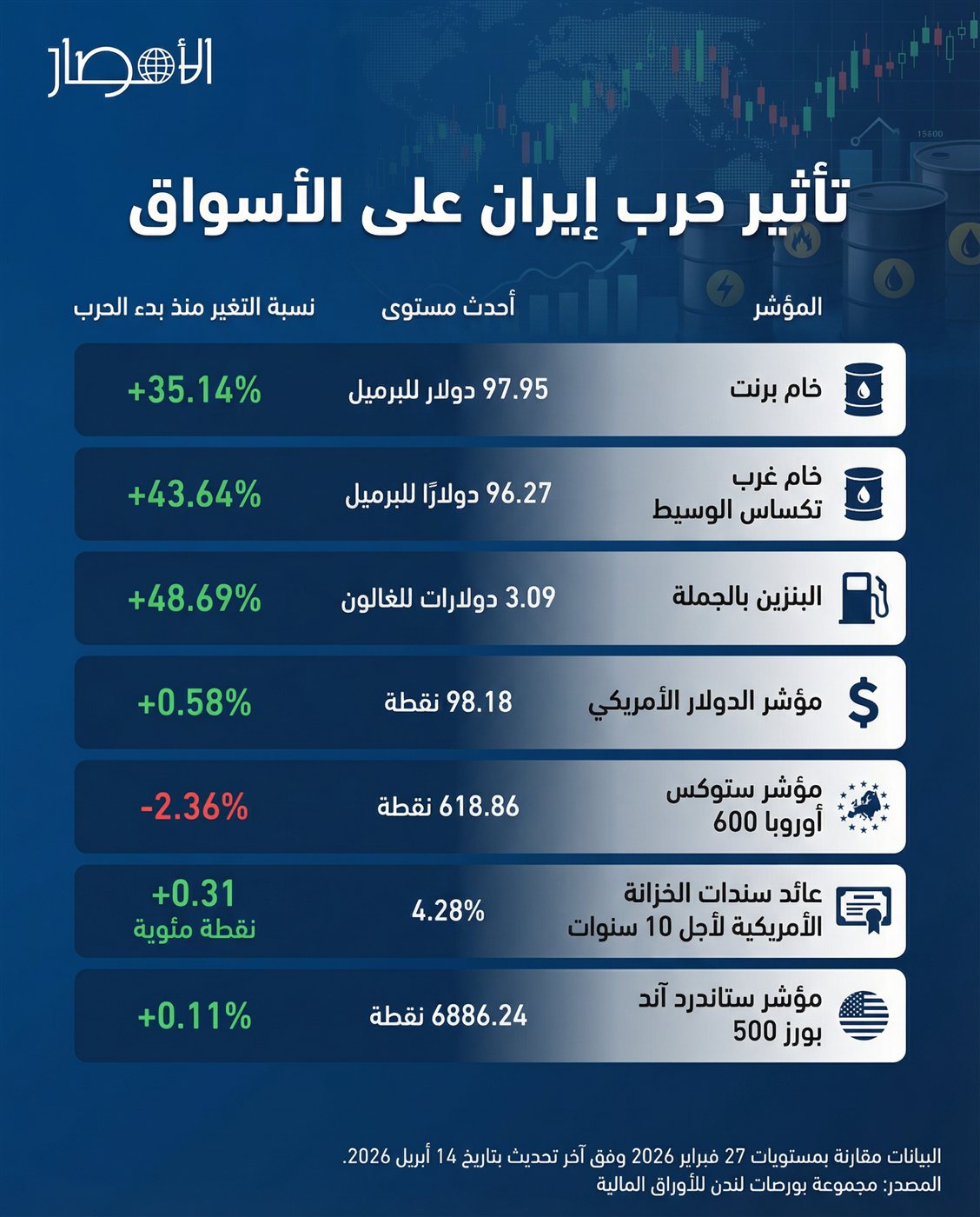 كشفت بيانات حديثة صادرة عن مجموعة بورصات لندن للأوراق المالية عن استمرار التأثيرات المباشرة وغير المباشرة لتداعيات الحرب في إيران على الأسواق العالمية، وذلك مقارنة بمستويات التداول في 27 فبراير 2026، وحتى آخر تحديث بتاريخ 14 أبريل 2026.