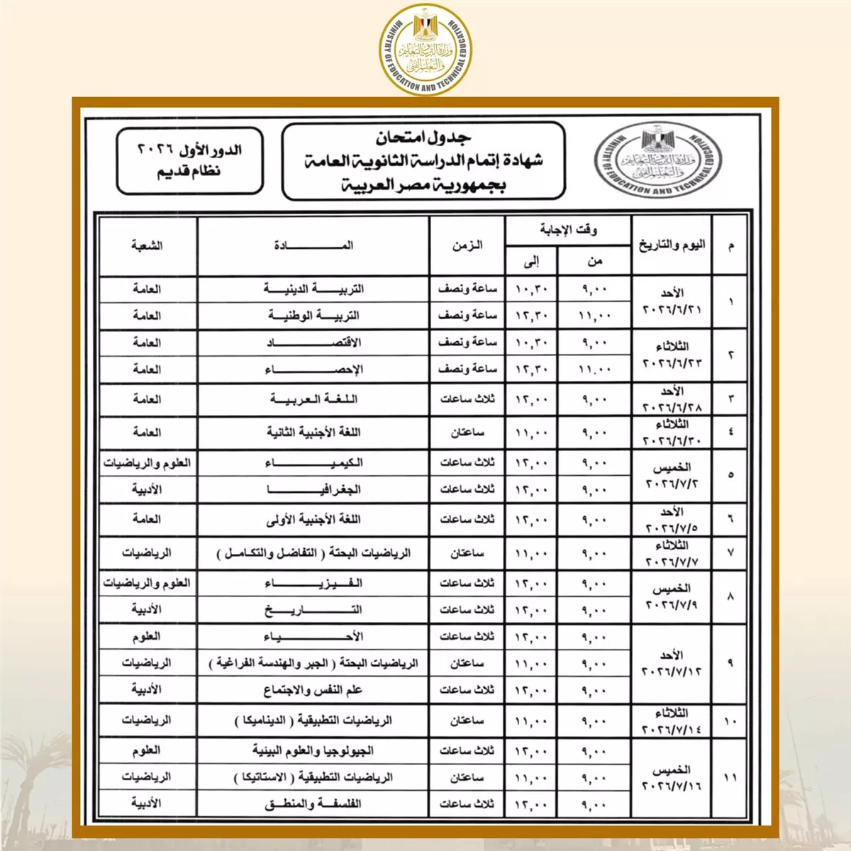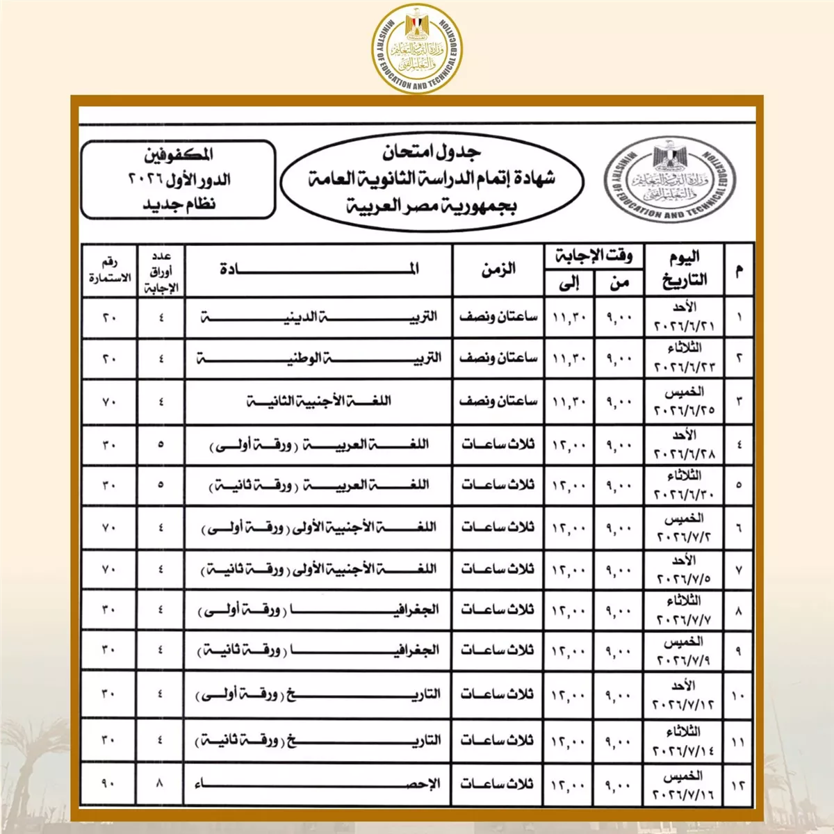 وبحسب جداول امتحانات الثانوية العامة، تبدأ امتحانات الثانوية العامة للدور الأول (نظام جديد - نظام قديم) والمكفوفين يوم الأحد الموافق 21 يونيو 2026، وتستمر حتى يوم الخميس 16 يوليو 2026.