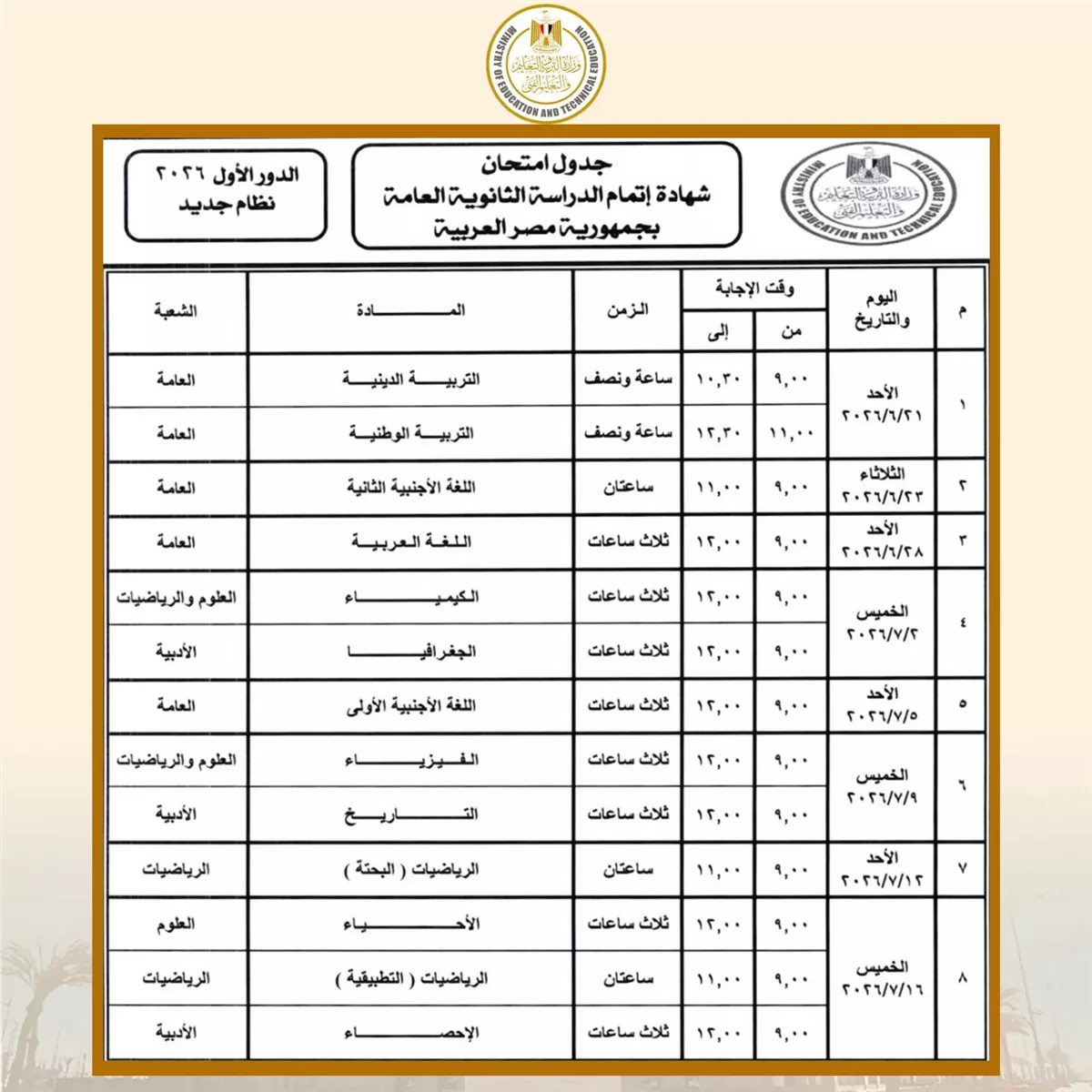 وزير التعليم المصري يعتمد جدول امتحانات الثانوية العامة 2026