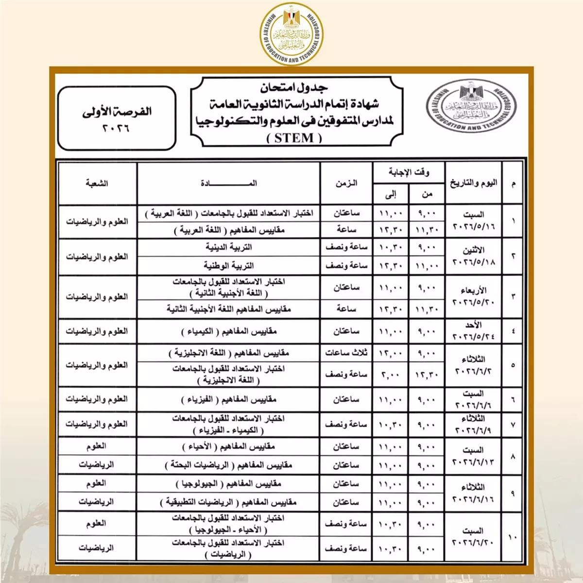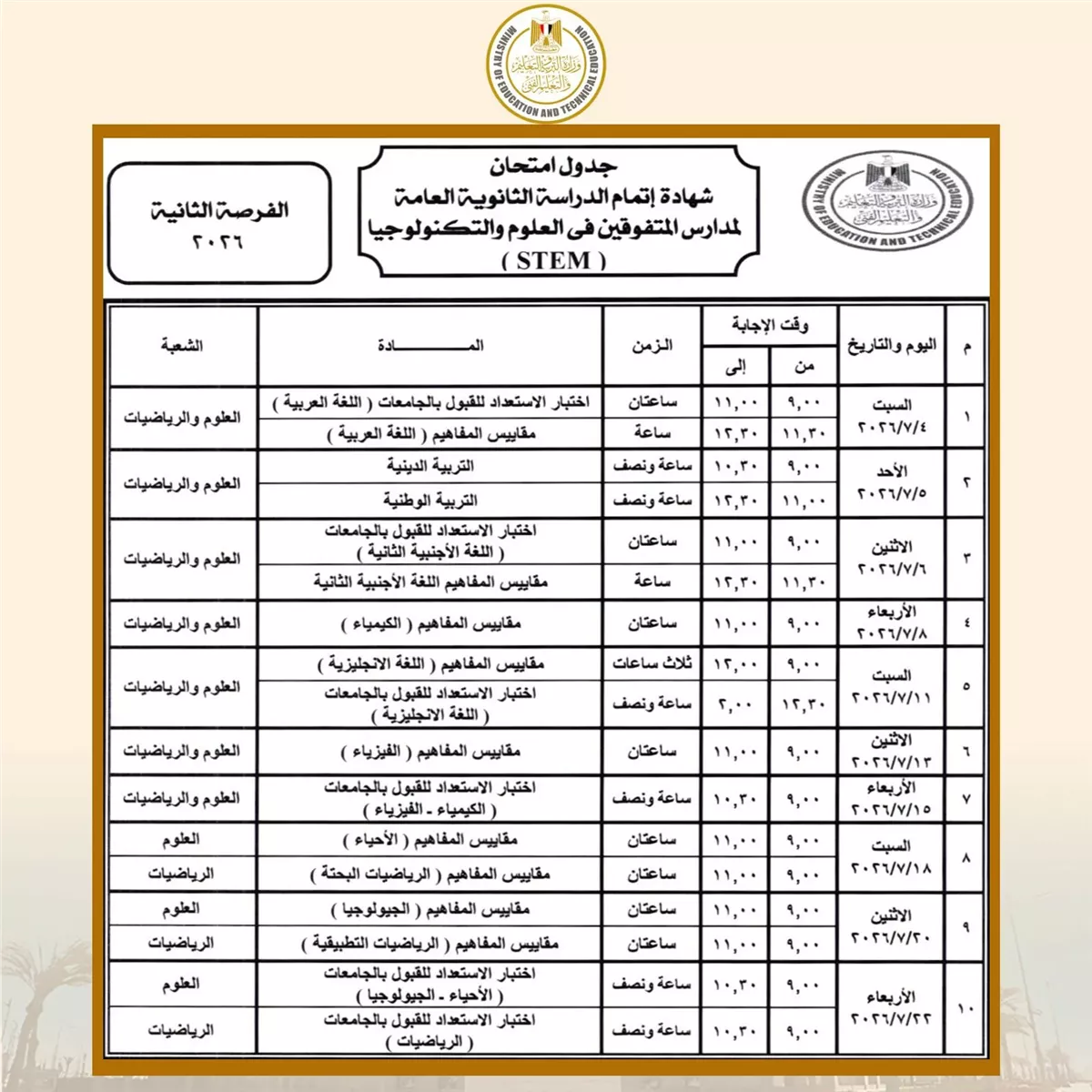 كما تبدأ امتحانات شهادة إتمام الثانوية العامة بمدارس المتفوقين في العلوم والتكنولوجيا "STEM” (الفرصة الأولى) يوم 16 مايو 2026 وتنتهي يوم 20 يونيو 2026، وتبدأ امتحانات (الفرصة الثانية) يوم السبت 4 يوليو 2026 وتنتهي يوم 22 يوليو 2026.