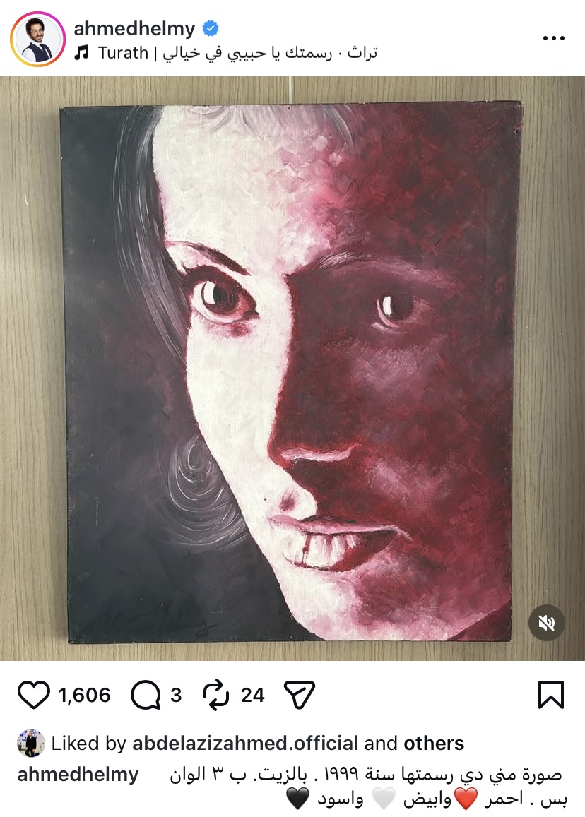 وكتب حلمي عبر حسابه على موقع التواصل الاجتماعي “إنستجرام”: "صورة منى دي رسمتها سنة ۱۹۹۹ . بالزيت. بـ3 ألوان أحمر وأبيض وأسود".