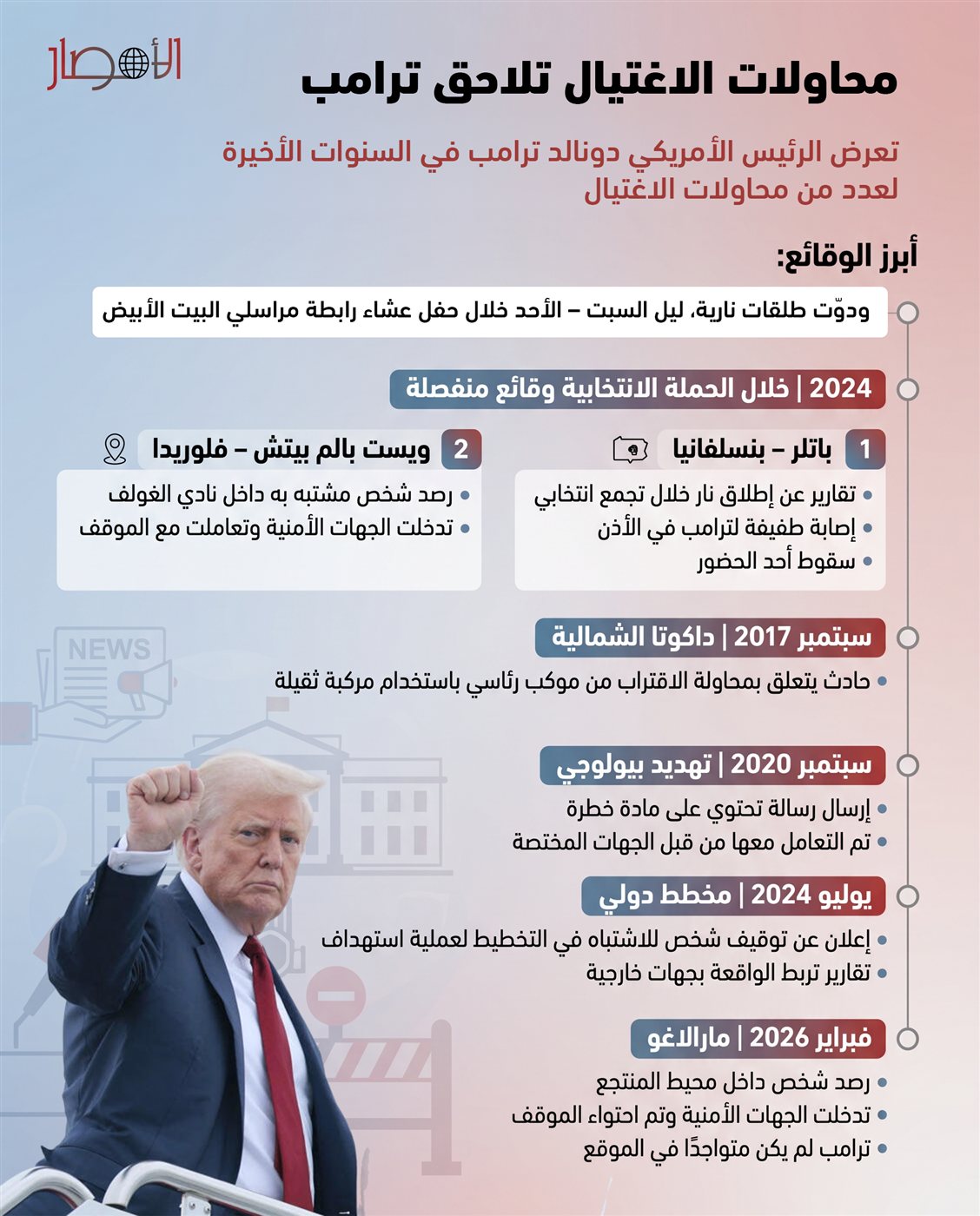 إنفوجراف| محاولات الاغتيال تلاحق الرئيس ترامب