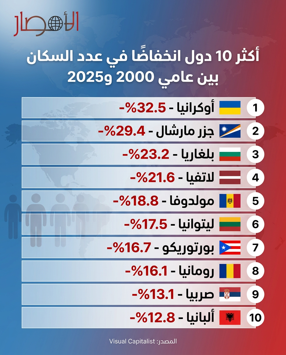 انفوجراف/ أكثر 10 دول انخفاضًا في عدد السكان بين عامي 2000 و2025