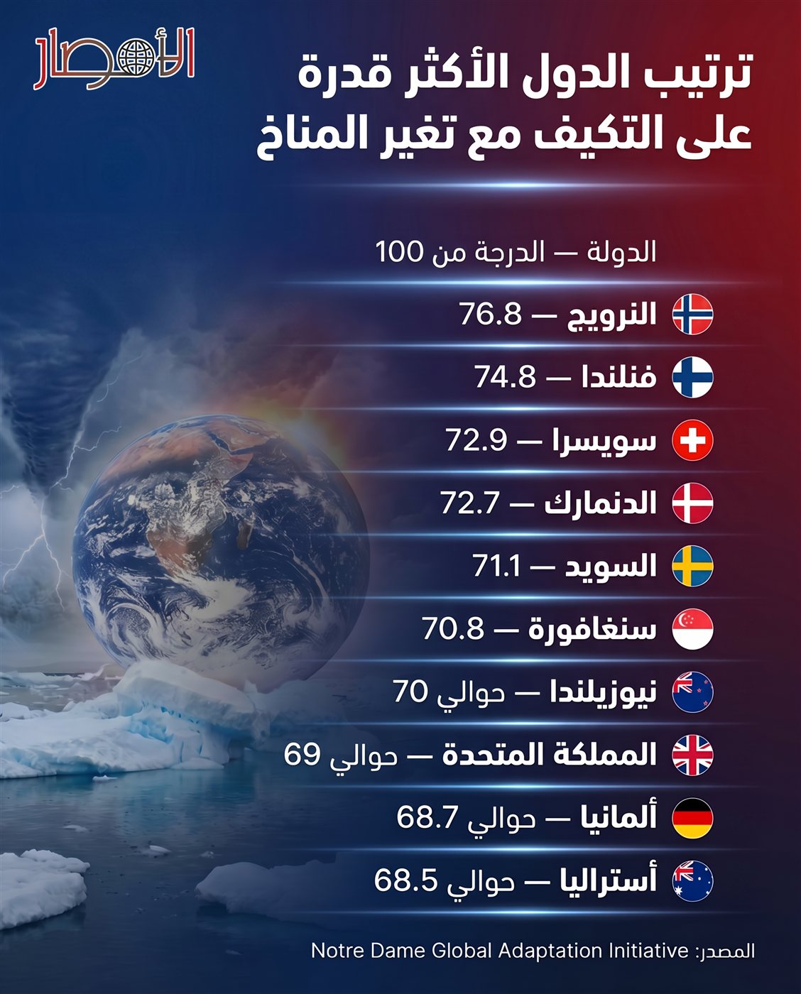 كشف مؤشر مبادرة جامعة نوتردام العالمية للتكيف مع التغيرات المناخية عن قائمة الدول الأكثر قدرة على التكيف مع التغيرات المناخية، استنادًا إلى درجة من 100 تقيس مدى استعداد الدول لمواجهة آثار التغير المناخي من حيث البنية التحتية، والاقتصاد، والحوكمة، والقدرة على الاستجابة للأزمات البيئية.
