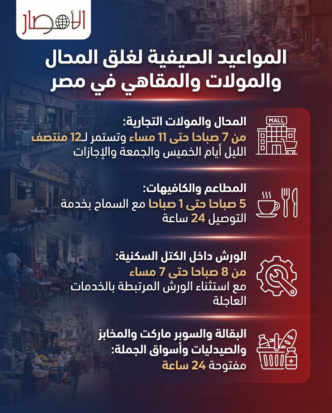 بالإنفوجراف| المواعيد الصيفية لغلق المحال والمولات والمقاهي في مصر